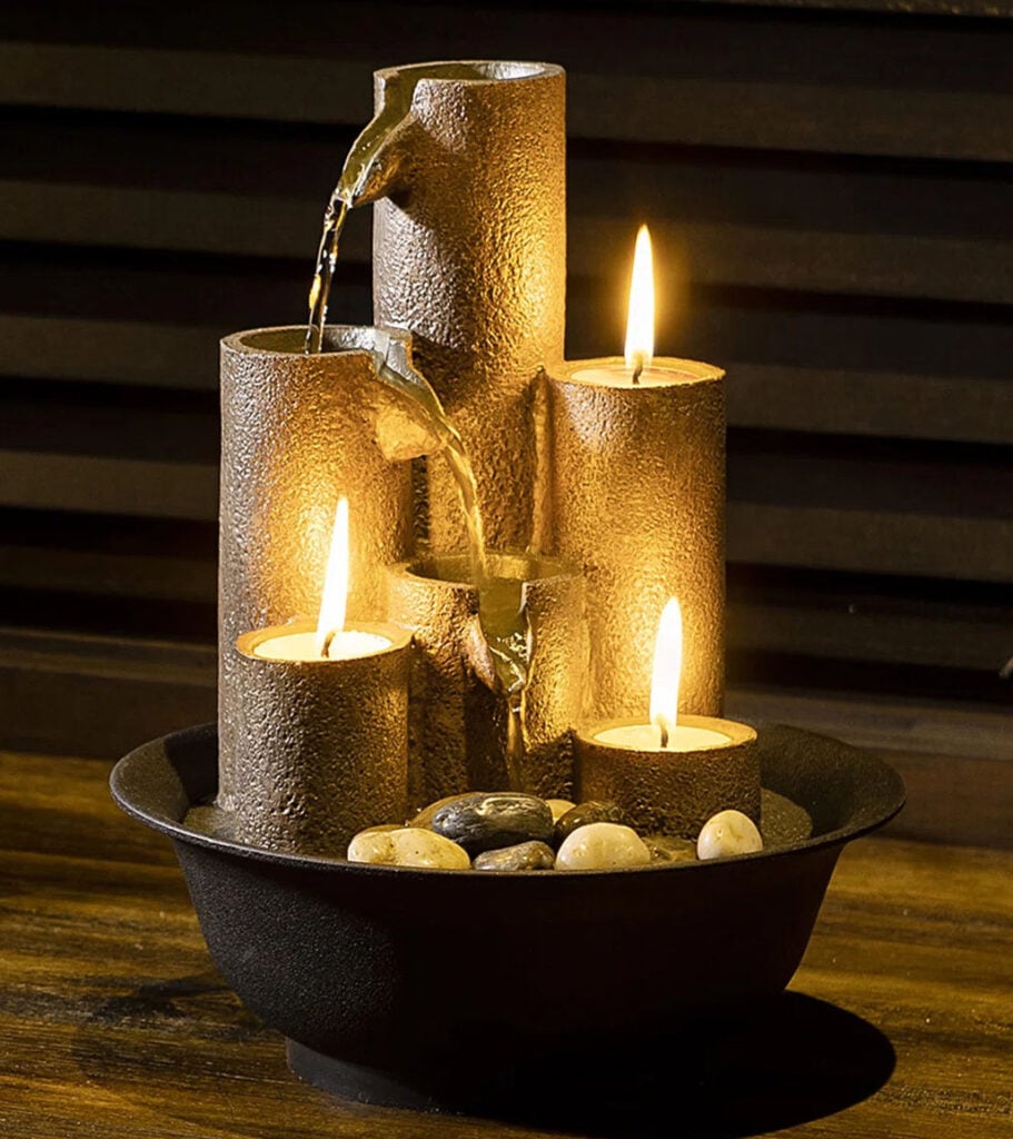 Concerning beauty, many will find this indoor fountain to be quite attractive, as would this writer if not for the rather sterile perfection of the form, a consequence of it being made in a mold and not by hand, and for the material of which it is made. The fire and water make a wonderful contrast and that has its appeal. You would not want the candles lit if there are any children or animals that can access it.