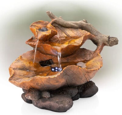 The design of this indoor fountain this writer finds to be quite lovely, or would, were it not made of fiberglass which is glass filaments soaked in a plastic resin and in this case, painted over with ordinary paint. The over-obvious lights and battery in the bottom leaf are also severely distracting and seriously reduce the aesthetic value of the piece by violating the unity of composition (a principle of aesthetics). It might be possible to camouflage the battery and possibly the lights with some other natural components such as a branch or small glass leaves and still have the lights show.