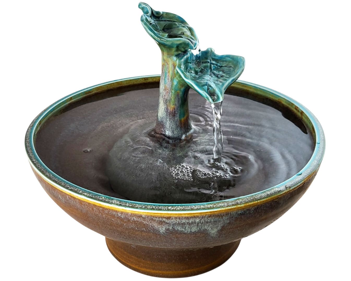 A high capacity, two stream with a cascading flow. Your cats can drink from the from the two streams, the leaves and the bowl.ย  Excellent for long hair and short faced cats, for stream lovers and for home decor. This fountains does not take the Cat Taps.