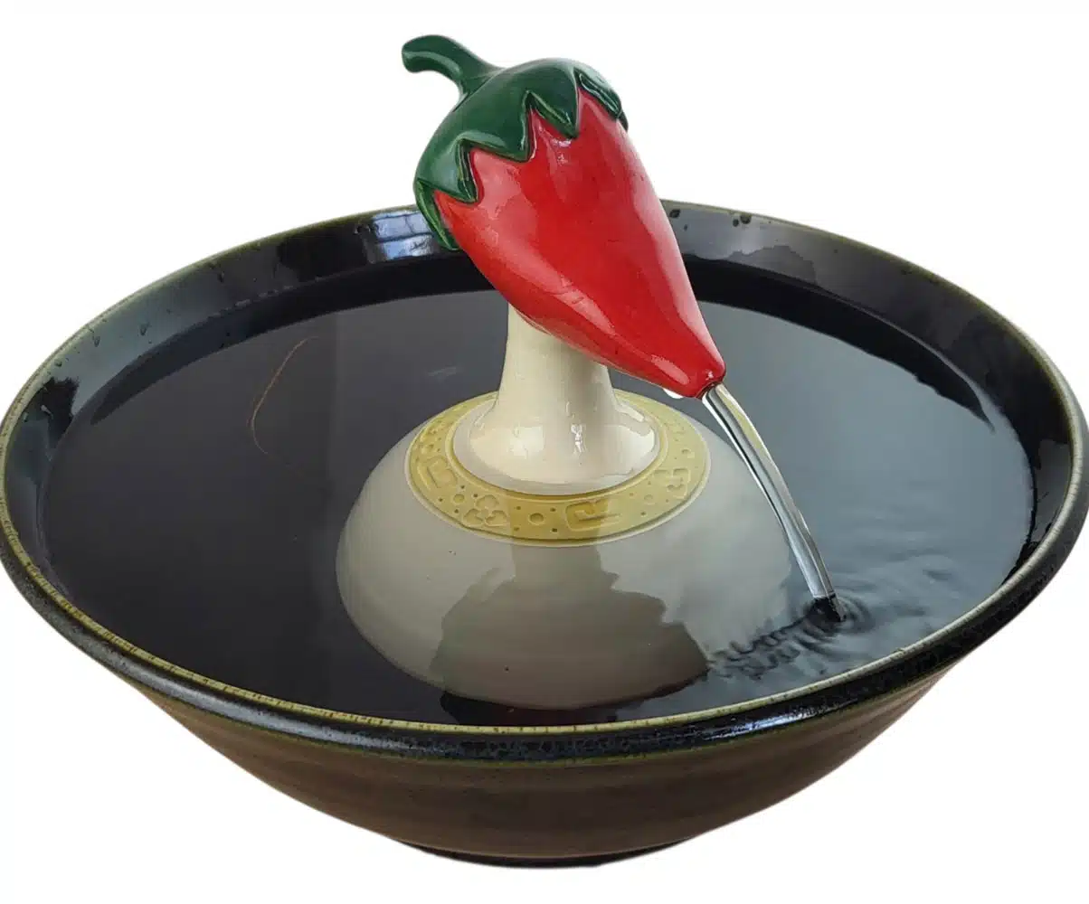 This what it looks like, a chile pepper spewing a stream of water – All formed by hand. Your cats can drink from the stream and the bowl. Excellent for longhair cats, short muzzle cats and for stream and faucet lovers. NOTE: The stream is close to the edge of the bowl so if your cat is a messy drinker (and some are) this may not be for you unless you put a mat under it.