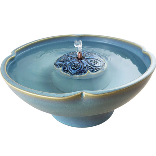 A gorgeous, ancient Persian inspired center piece design in Dark Tidepool and Caribbean with the high capacity, arabesque bowl in Bermuda. For a closer look click the lens icon in the bottom right of the images and use the arrows to scroll through. You can create a stream by adding aย Cat Tapย which you can easily swap in and out with the included copper piece. All are antimicrobial.