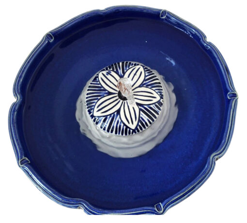A bright, rich fountain in April Blue and Ivory with a Pinwheel motif on the center piece in an Arabesque bowl. You can create a stream by adding aย Cat Tapย which you can easily swap in and out with the included copper piece. All are antimicrobial.