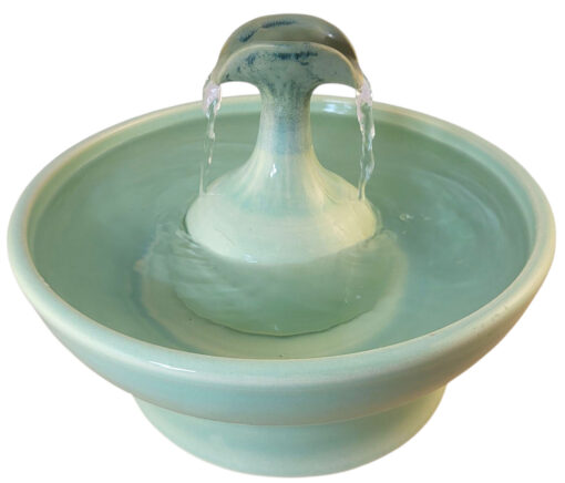 A lovely cat fountain glazed in Titanium Green with the flower in Jungle Green. Water fills the flower and flows from both sides into the bowl. Your cats can drink from the flower, the streams and the bowl. Great for longhair and short faced cats and faucet lovers, and of course, shorthair cats will love it too. REDUCED due to a small white spot in the interior bottom where the over glaze did not cover the under glaze of Cream. This is not easily noticed and has no effect. Please see the last image.